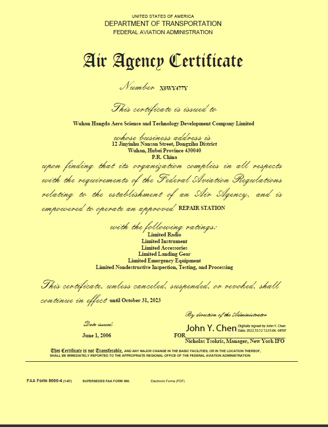 2001年10月 公司獲中國民航總局授權(quán)的民航維修許可證。